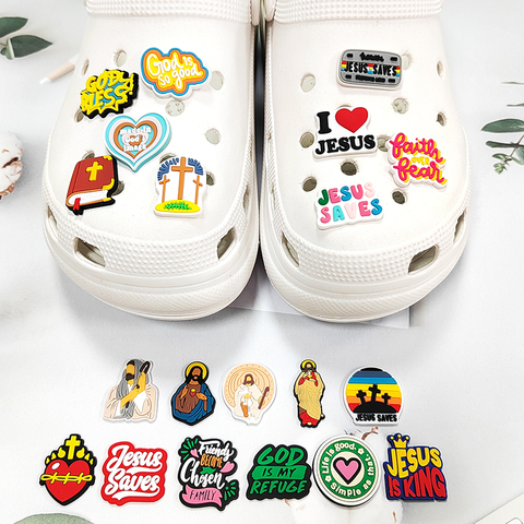 Venta al por mayor de zapatos cristianos amuleto religioso Jesús Dios PVC Zueco zapato amuleto adecuado para mujeres adultas zapato religioso amuleto